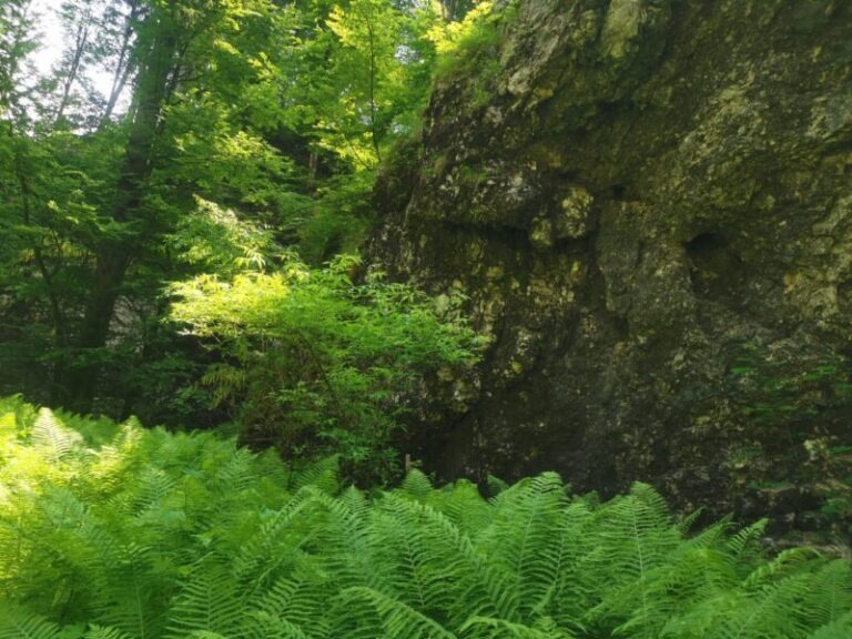 Or you can continue to the high natural bridge and wooden gallery from 1930. Now you climb along the wooden steps through narrow steps, and you will come to upper part of the gorge. Here you will walk through nice fern forest. We recommend the use of a good map or hiking navigation, as the GPS tracks of the described route are partly off-road.